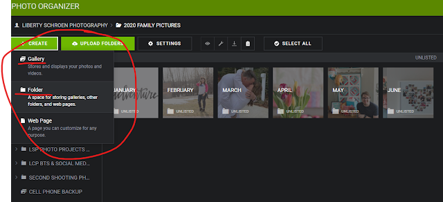 When I'm uploading a new month, I create the monthly Folder and then create a gallery for each of the sub-folders that I created on my computer. Then you just upload the photos to each gallery and you're all set. So, for June, I created a FOLDER named June and then GALLERIES named
